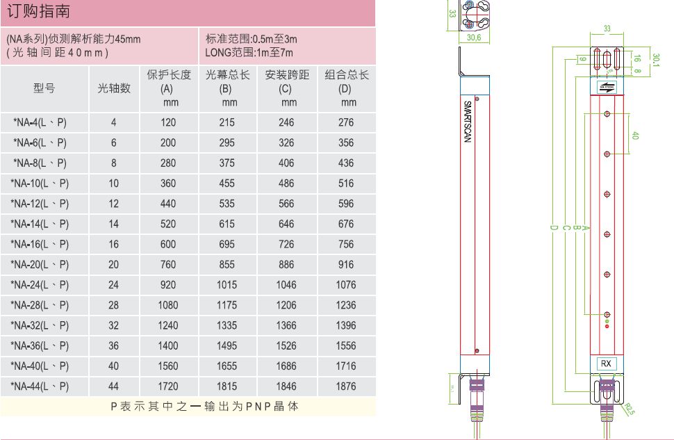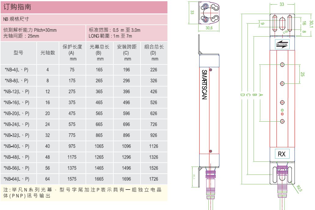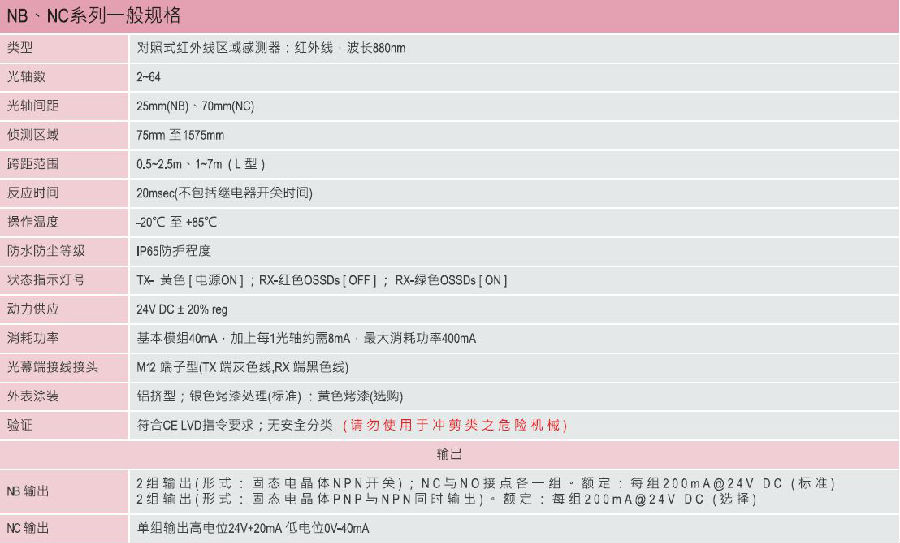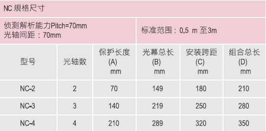 • 光轴间距有25mm(NB)、40mm(NA)、70mm(NC)系列及光轴可任意设定之ND系列 ( ≧ 70mm) 可供