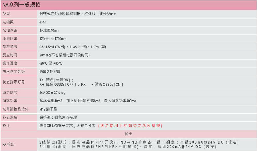 N系列区域感测光幕,以价格优惠,品质稳定,型式种类多样化,易满足客户需求,是最适合使用于区域范围内检测,保护、检查、判别等多样化用途感测光幕,产品并符合欧洲电器产品指令LVD要求,具CE标示 。